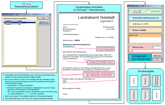 WoJugA erweitert die Möglichkeiten der standardmäßigen Serienbrief-Textfunktion von „OK.JUG“ um die Nutzung von variablen Texteingabefeldern, Listenauswahlfeldern und Optionskästchen im Formularbetrieb. Durch die Verwendung fertiger Textblöcke, die im Formularmodus bei Bedarf nur „einzuschalten“ sind, können vorbereitete Standardvorlagen in kürzester Zeit individuell angepasst werden. Neben der Texterstellung bietet WoJugA einen zweiten Funktionsbereich zur flexiblen Druckausgabe der Schriftstücke. Dabei können neben Original und Entwurf bei Bedarf Anlagen, Ausfertigungen und Abdrucke automatisiert erstellt werden. Das nebenstehende Schema zeigt den Ablauf bei der Erstellung und der anschließenden Druckausgabe eines Schriftstücks mit dem System WoJugA.
